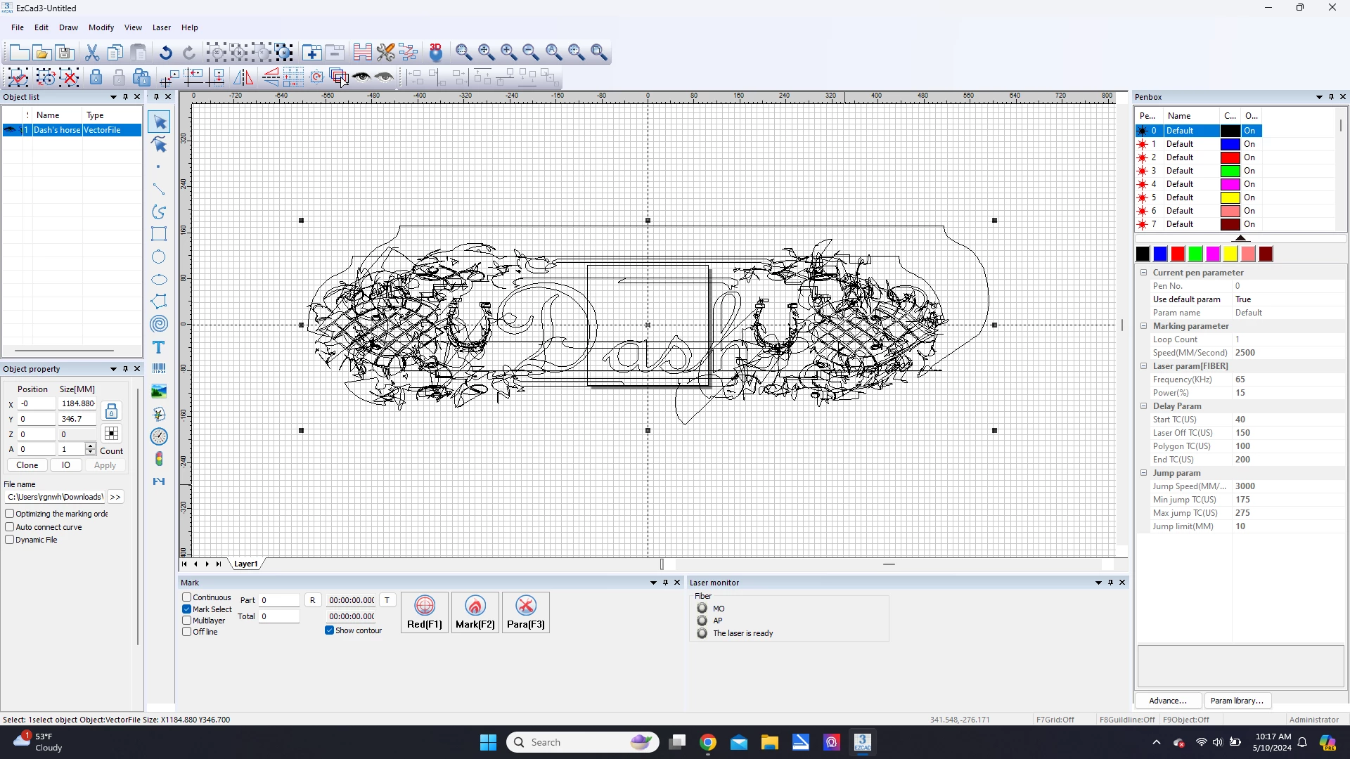 But this time, the perfectly good looking SVG icon from Illustrator just appears like a random line squiggle in EZCAD. Note that EZCAD software has not changed, the only variable here is Illustrator.