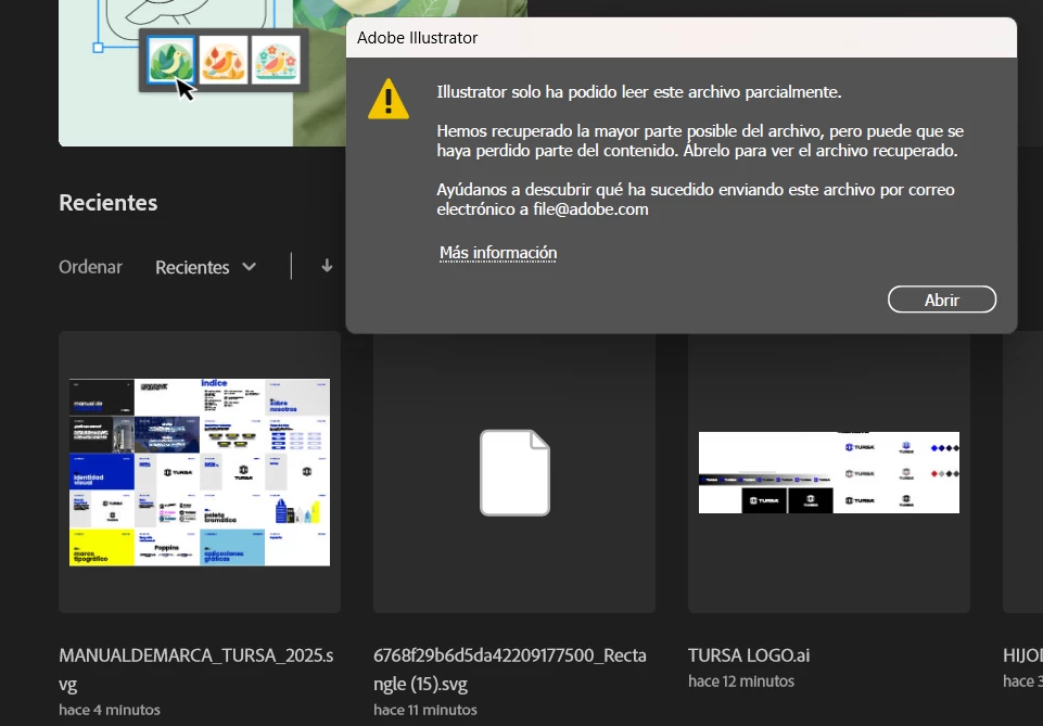Hello, how are you? I had a video call today to present a project, and when I went to open the file, I encountered the message "Illustrator was only able to partially read this file." The file is on my C drive. I had been working on it and saved it (the file was already saved; every time I make changes, I go to File > Save to keep the updates). After it was fully saved, I shut down my computer. Later, when I came back and opened it, this message appeared. I clicked to open it anyway, and the entire file is completely blank. I tried recovering the file through data recovery, but the folder is EMPTY. I updated Illustrator, but the same error occurred. I tried opening it in Acrobat, and it says the file is damaged and cannot be recovered. However, when I go into Illustrator, I see a preview of the project in the Recent Files section... I followed some advice I found in the forum, but nothing worked. Is it possible to recover it?