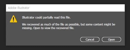 I have been facing multiple messages with regards to my source files on AI. The pop-up message indicates " Illustrator could only partially read this file". Files were fine before the updates and after the updates, I cannot access any of my files now. These are source files and before I get into a “Full Panic” mode, I really hope its a glitch on the latest updates, as I have absolutely no access to my sources other than AI. I have tried the recommended recover steps by opening the AI files on PDF mode then save it as PDF then open on AI again, unfortunately, AI doesn’t read the files.