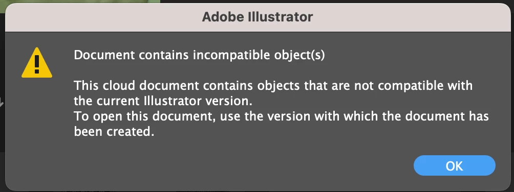 This cloud document contains objects that are not compatible with the current Illustrator version.