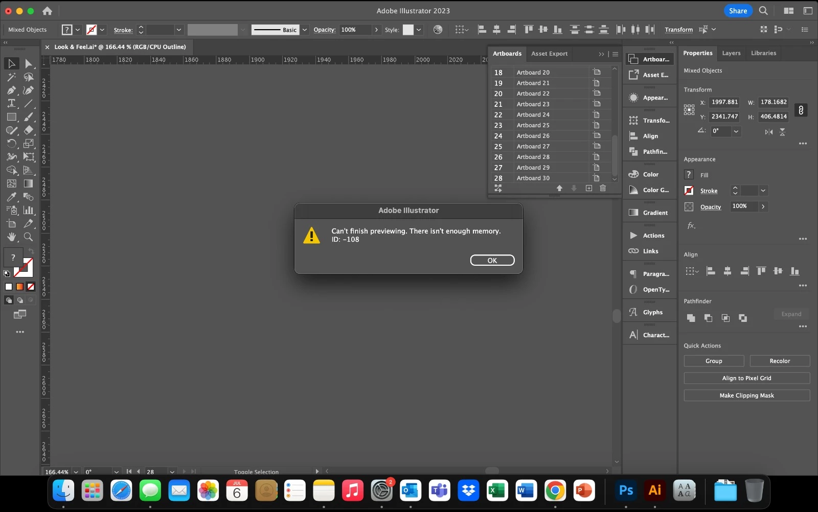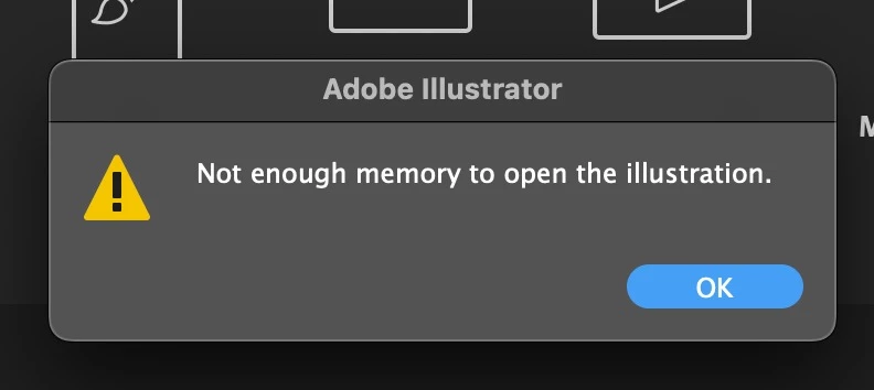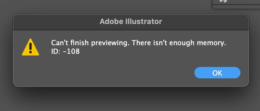 Illustrator crashes, unable to save file & not enough memory ID: -108 error