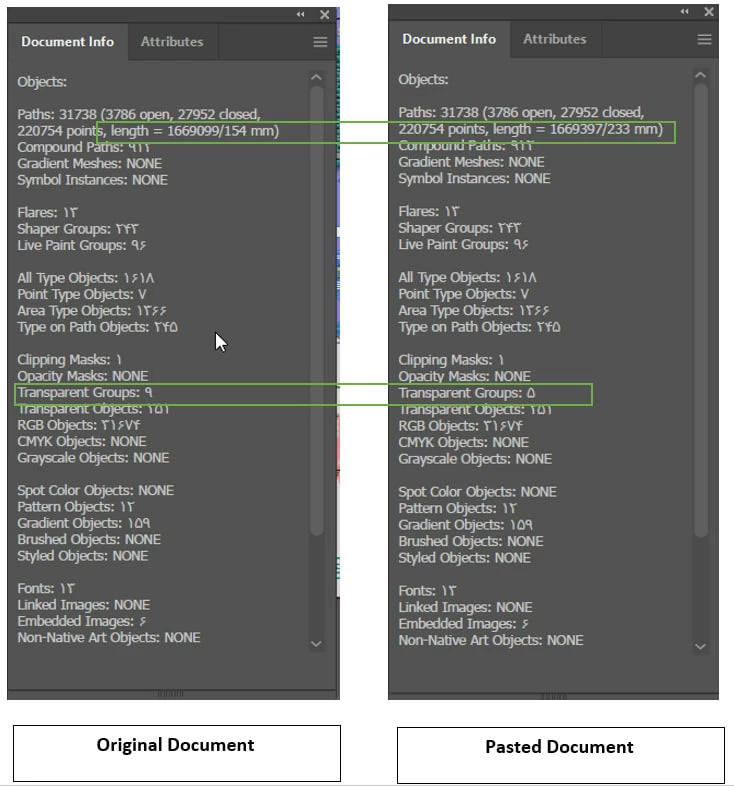 I Selected All objects (Select>All), then Copy them and Paste them in another artboard in another illustrator file. So I look at Document info and see some differences between initial file and last file information that shows some objects are not Copy/Pasted probabely. Who knows what problem is and why these 2 documents have some differences?