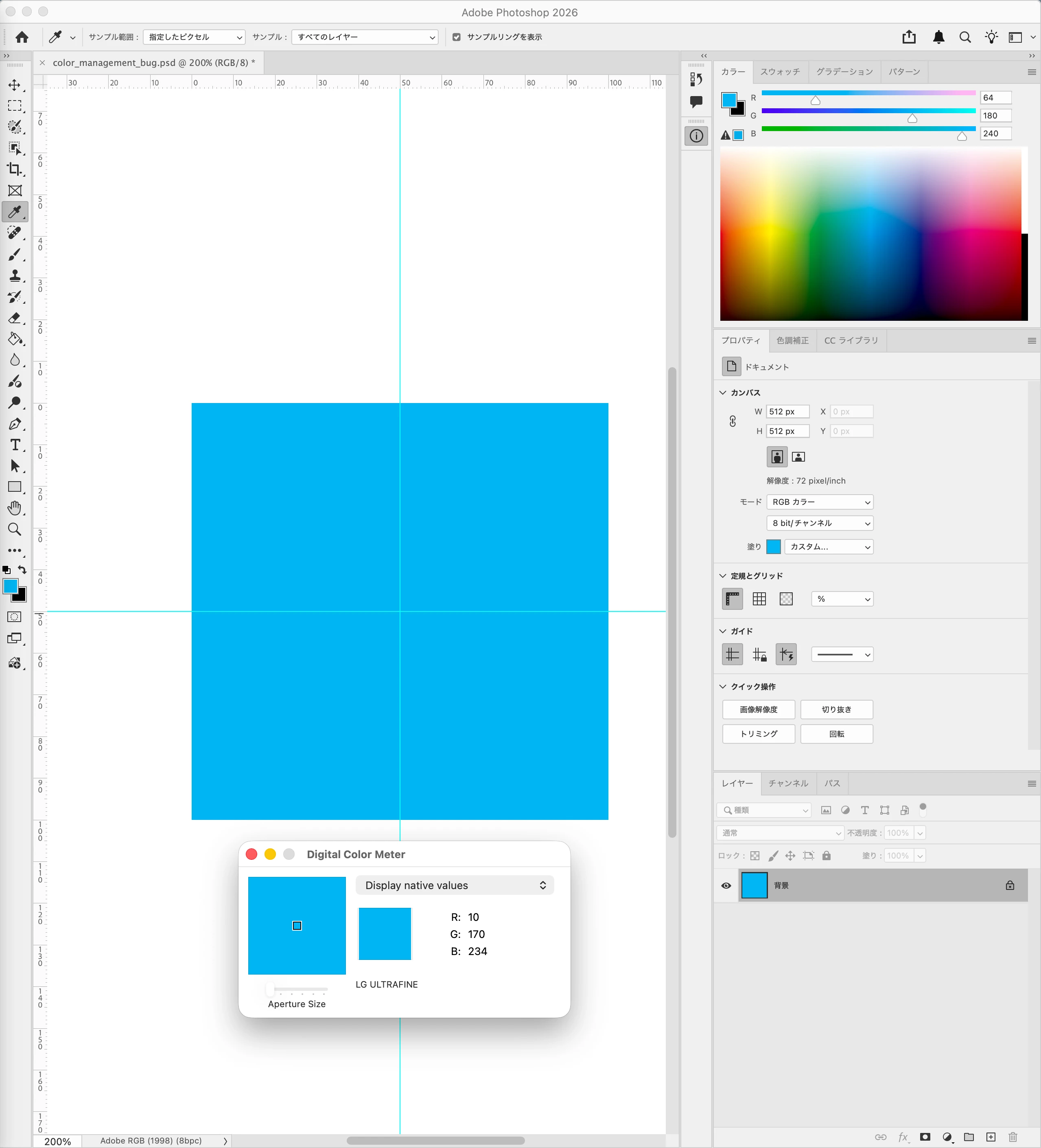 I checked the software settings in the screenshots below: both files use the Adobe RGB (1998) color profile, and the color management settings have been synchronized via Adobe Bridge. I’ve also attached a minimal reproduction file. I hope this bug can be fixed soon.