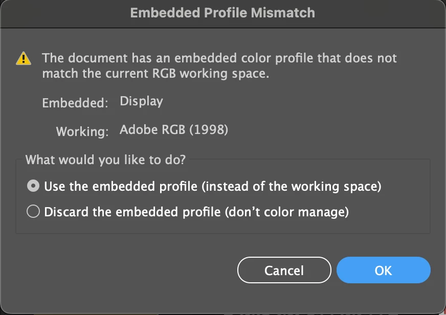 I've had Illustrator for a couple of years and this is the first time ive run into this problem. I tried to open my .ai file and there is an embedded colour profile mismatch which has never been a problem as I would still be able to open the file and run it smoothly. However this time I've tried to open one of my files and the mismatch problem comes up and I select OK but nothing proceeds. The file never opens and im just stuck with the mismatch prompt not going away. Theres no notice of an error or corrupted file or anything, just nothing happens. My mac is updated and so is Illustrator so im not sure of the problem and I've tried restarting my pc multiple times.