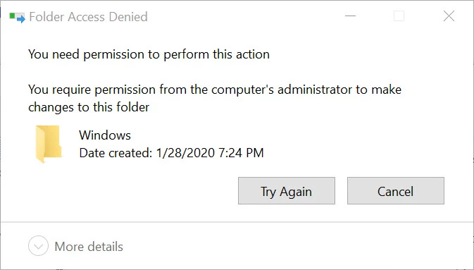 There is a problem with updating Illustrator using the Creative Cloud Desktop - the update fails with no diagnostics. So I tried to uninstall Illustrator completely. This appears to work, except that the folder C:\Program Files\Adobe\Adobe Illustrator 2020\Support Files\Contents\Windows does not get deleted. When I try to delete it manually, even when I sign on with administrative privilege, the attempt fails with a dialog box which says that I need permission to make changes to this folder (see screenshot below):