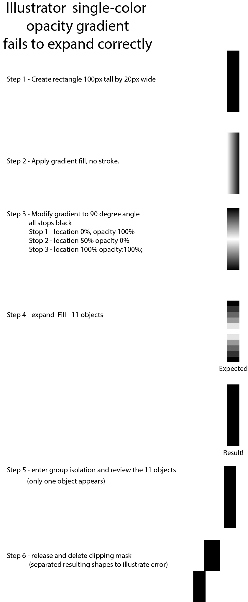 When creating a single color opacity gradient and then expanding the shape to create separate objects, you get messed up results: A clipping mask with two solid rectangles in it regardless of how many objects you told it to create when you expanded the shape.