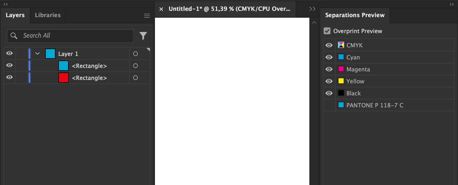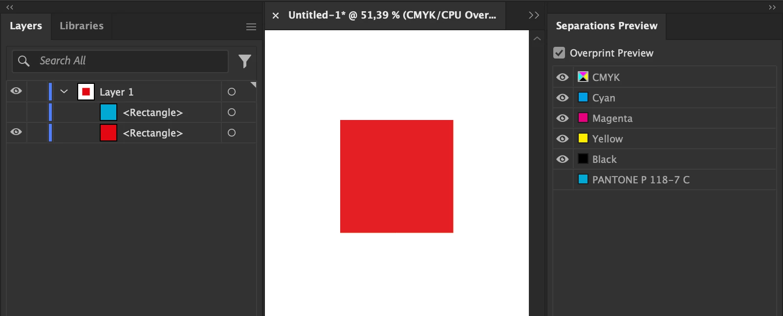 In the example I'm attaching the blue color is a spot color and the red is a process color. When I turn of spot colours in the separations menu red doesn't show but when I turn off the blue layer it does. How do I get to find the red colour without turning everything off and on?