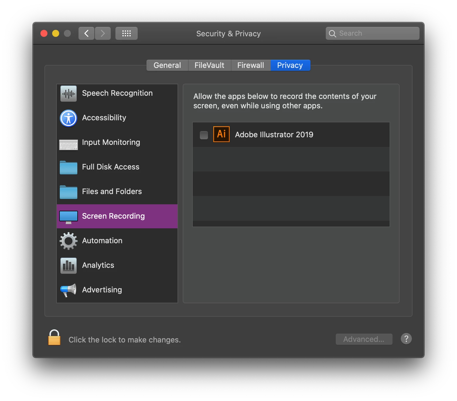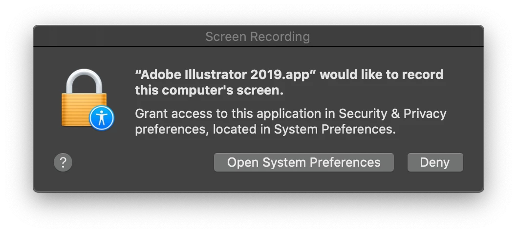 However, I was quite disgruntled and confused when Iluustrator (which I use on a daily basis) requested permission to record my screen? Is this something nafarious, or does it 'techically' class as screen recording but actually Illustrator just needs these permissions to function correctly? I have up-to-date CC and Iluustrator, and the only third-party plugin I have installed is VectorScribe by Astute Graphics—maybe it's something to do with that?