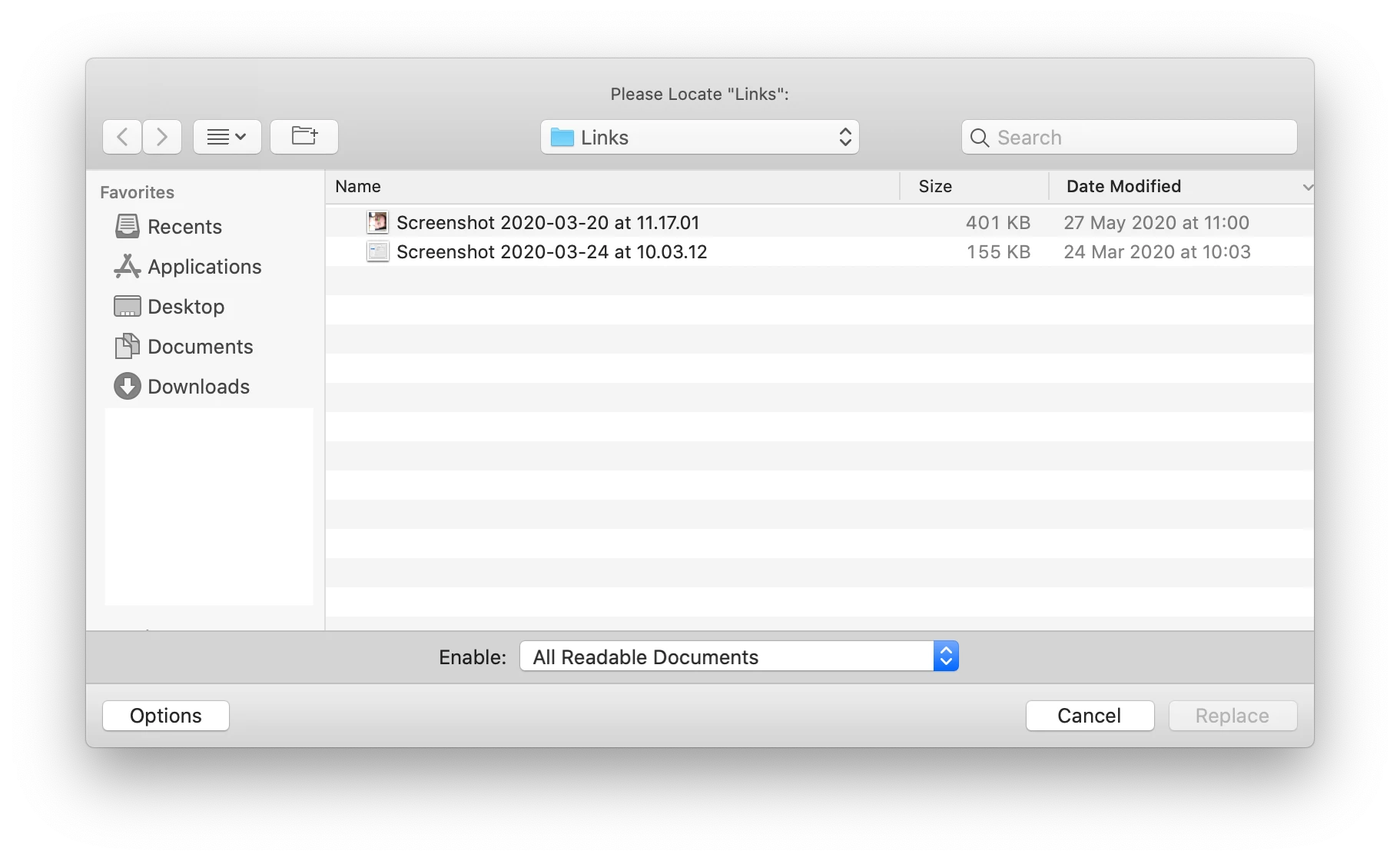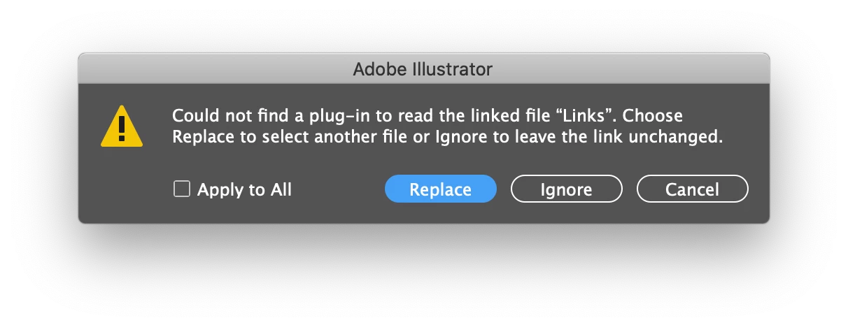 'Could not find a plug-in to read the linked file "Links". Choose Replace to select another file or ignore to leave the link unchanged.' (screenshot attached)