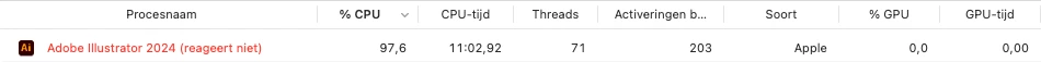 I have a macbook pro m1 max, 32gb ram, 1tb ssd. I tried openning illustrator 2024 and beta, photoshop 2024 and beta, premiere pro 2024 and beta, etc...  as in the picture, it stays there, "Freeze"