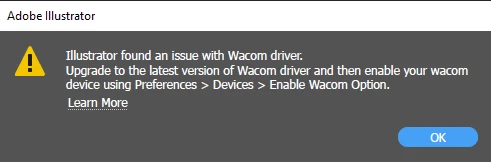 O Illustrator não reconhece o dispositivo. Pede para que eu atualize os drivers da Wacom.
