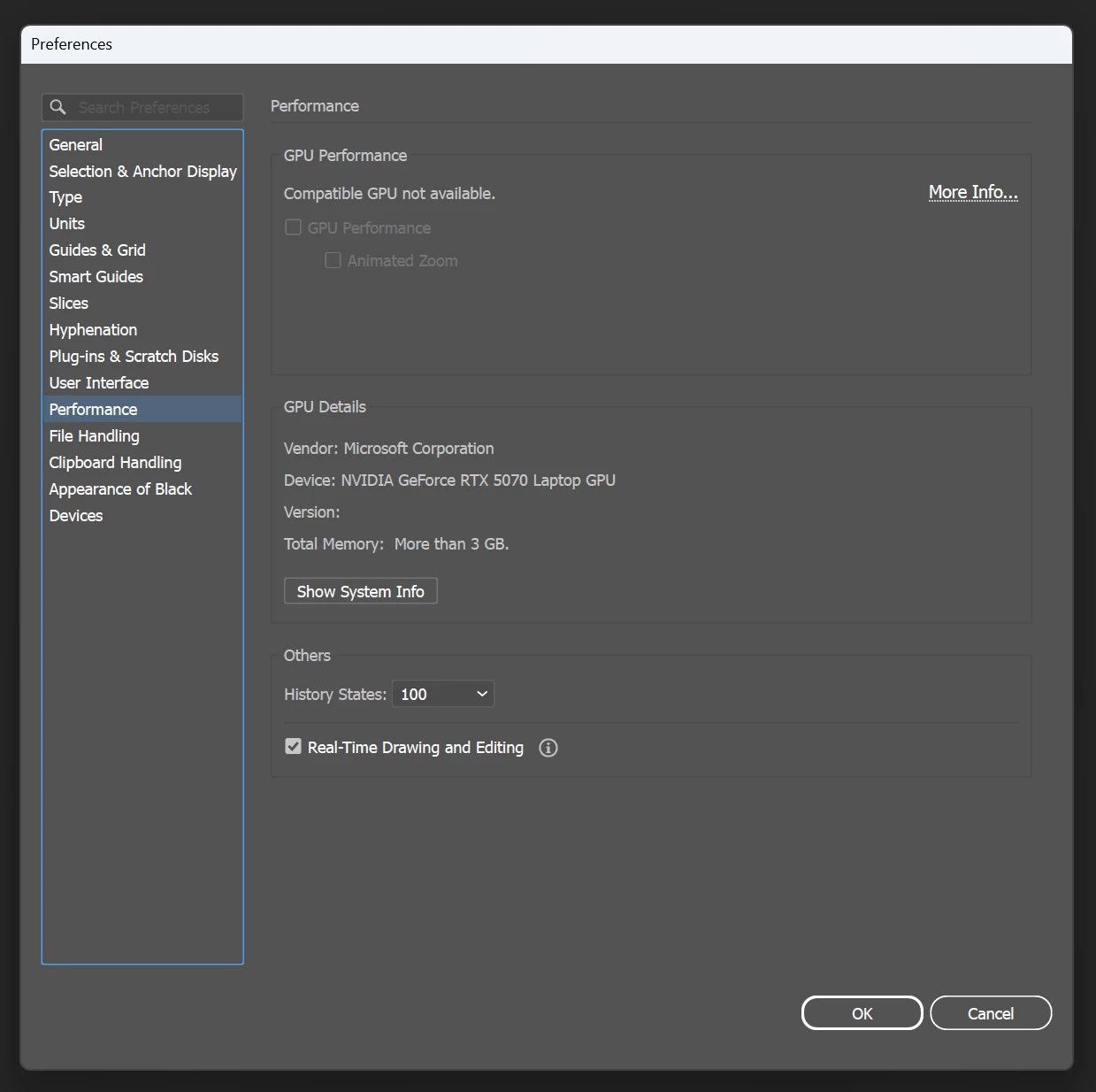 Illustrator not recognizing NVIDIA RTX 5070 - shows Microsoft Corporation instead