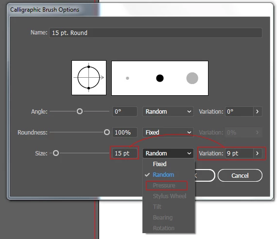 So I want to make a pressure sensitive BRUSH in Illustrator. I make a brush, set the pressure sensitivity to 9. All is good right?