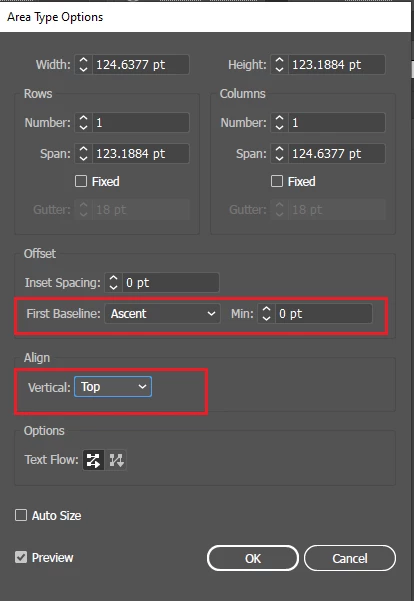 Illustrator Plugin - How to set Vertical Alignment and Baseline options inside Area Type Options