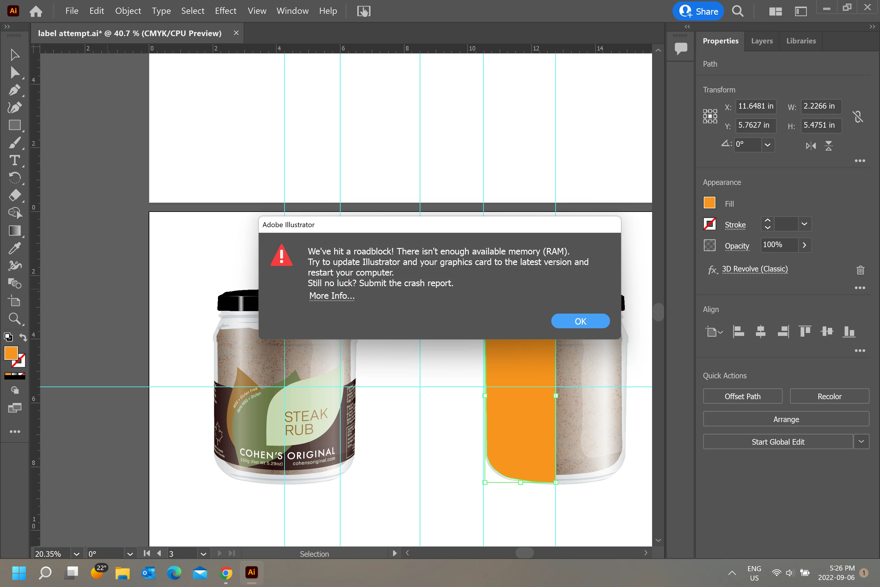 I'm also getting alerts that say that there isn't enough RAM to display artwork or preview things. Sometimes it will crash, sometimes it just takes a giant pause of several minutes.