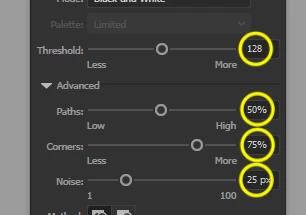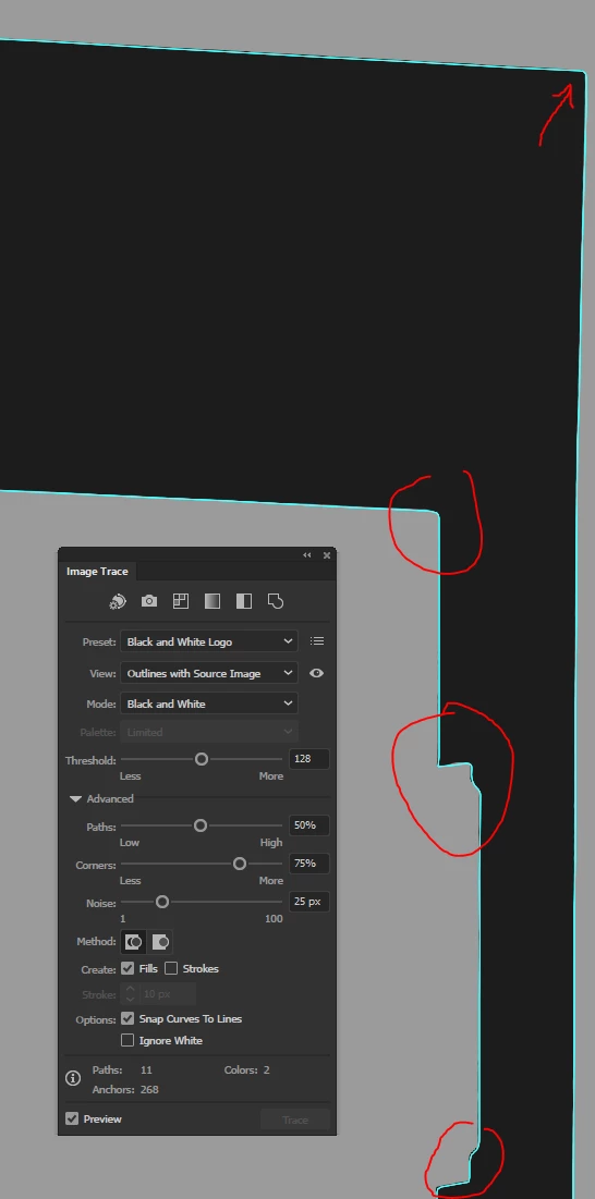 I have a job going where the client needs me to supply them with SVG masks made from 3D file renders. Even if I plug a stupid-high resolution file into illustrator - it just messes up and doesn't see all the detail, which is dumb. The following is the best I could get tweaking the sliders around: