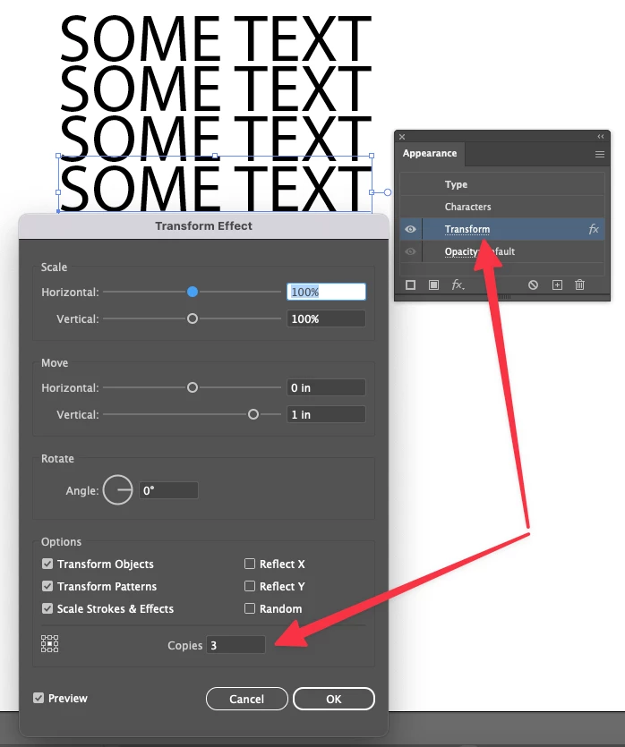 I am trying to retrieve or modify the value in the count field of a Transform Effect for a Text Frame in Illustrator using a JavaScript script. I have successfully been able to access the Text Frame and change the text, but I am struggling to figure out how to access the value in the count field for a sepesific Transform Effect.