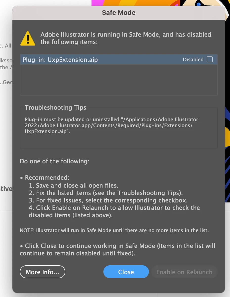 When I try to follow the troubleshooting instructions, it doesn't work because it instructs me to go to folders/files that do not exist. It says I need to update or uninstall "/Applications/Adobe Illustrator 2022/Adobe Illustrator.app/Contents/Required/Plug-ins/Extensions/UxpExtension.aip" but I can't find the actual plugin because the is no "Contents" folder inside of Adobe Illustrator 2022. There is no Plugins folder, just a Plugins file that is also a dead end. I already tried: Uninstalling Illustrator, then deleting Adobe Illustrator files from Library/Preferences, then restart Macbook Pro 2019 (I'm still on Big Sur because whenever I try to install Monterey another error window pops up, but that's an issue for another day), and then reinstalling Illustrator (same problem of "Error loading plugins..." occurs, and doesn't allow me to open Illustrator). Please help, thank you!