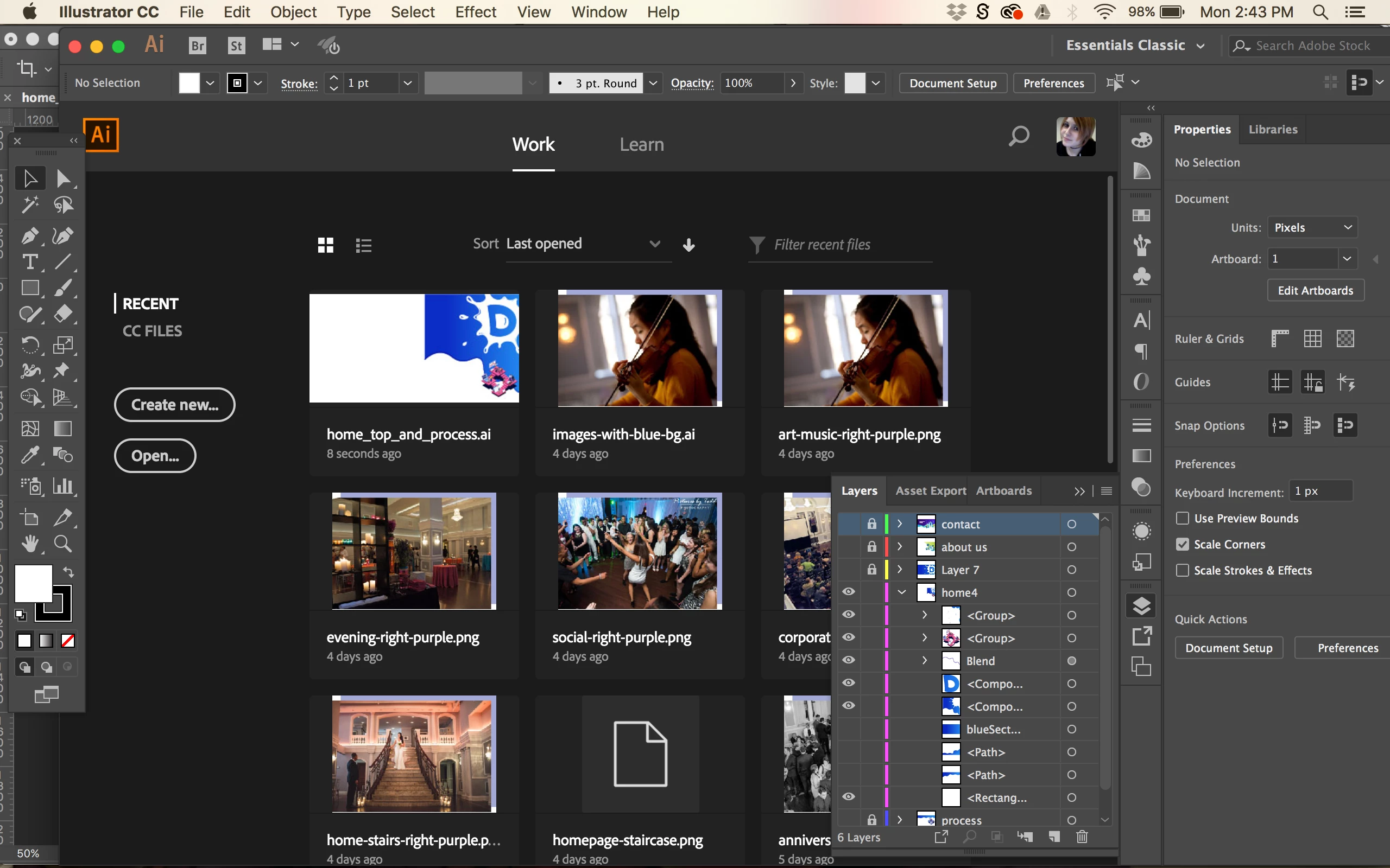 For a few months now, every time I try to open an Illustrator file, it won't open right. Illustrator opens, I can see the layers on the side, but in the center, all I see is recent files. I have to quit and try again over and over and over again until it finally opens (sometimes this takes 7-10 quits before It finally opens). This is driving me insane! I use Adobe Illustrator CC for Mac, it is up to date. I need this to stop happening. Below is what I see every time I try to open an Illustrator file.