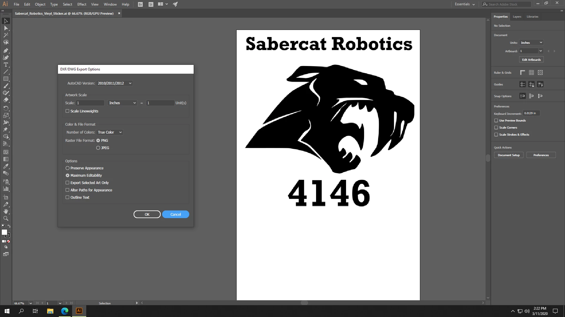 I'm currently working on a image for a school club that is to be used as a sticker. For some reason, when I try to export the image as a DXF file, a PNG file of the image is saved, along with a DXF file of the file location of the PNG image. I'm somewhat new to Adobe Illustrator and couldn't find anything else about this problme here, so any help is aprecciated. I'm currently exporting using Autocad version 2010/2011/2012, with maximum editability and true color selected. I'm also using Windows.