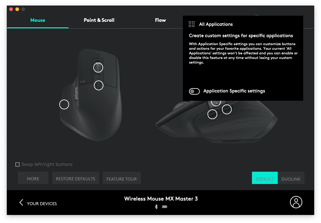 open logi option, choose the device - go to All Applications - Disable Application Specific Setting.
