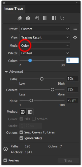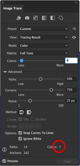 So I go to Illustrator, place the PSD, open Image Trace and set it to color and limit the number of colors to 7.