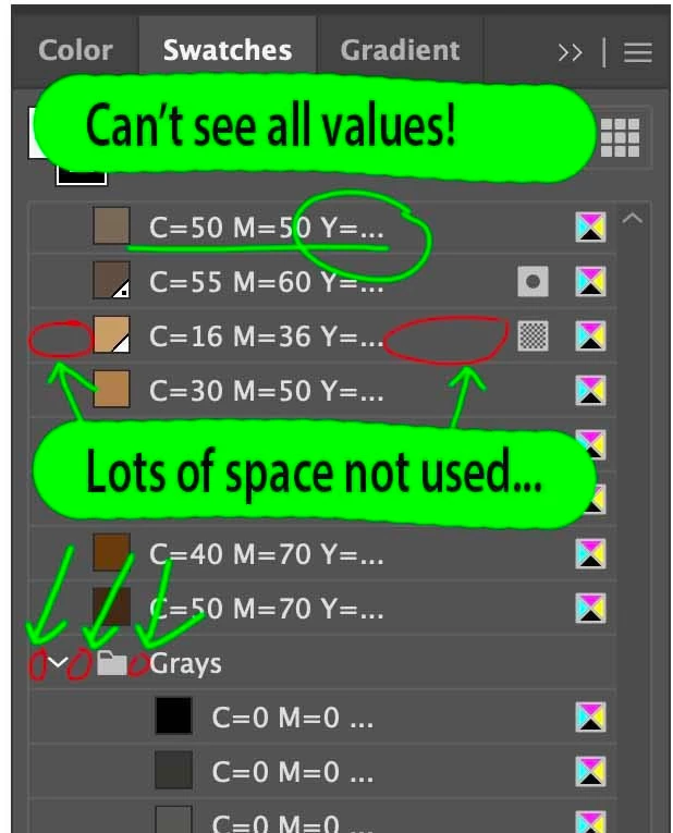 Is it possible to Reorganize the SWATCHES WINDOW to be able to see ALL colour values?