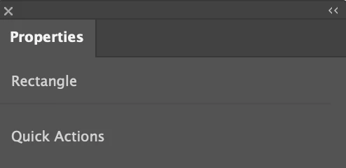 The Properties panel only shows limited options (e.g., "Rectangle" and "Quick Actions") and does not display the full range of properties for the selected object.