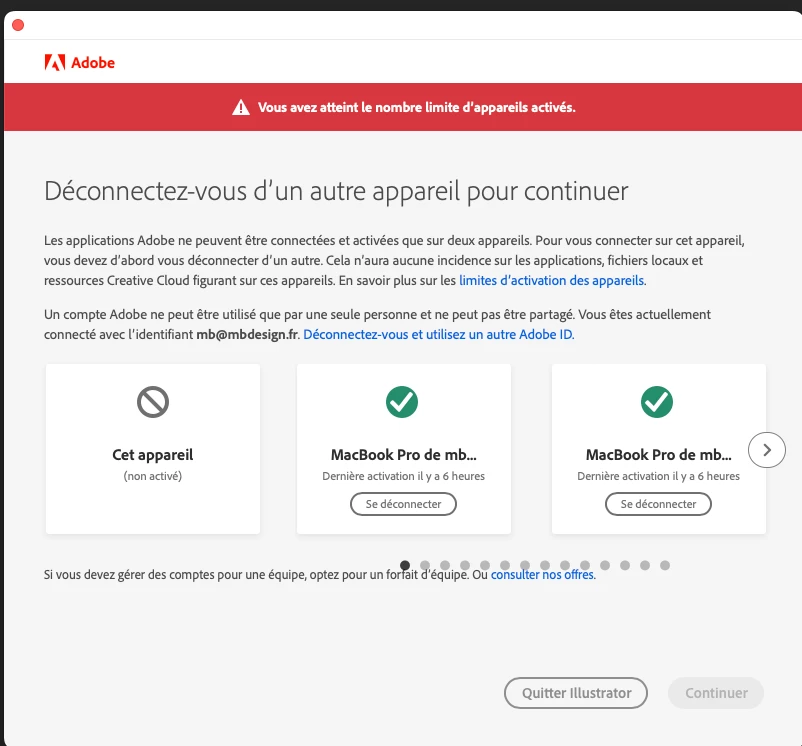 When I launch Illustrator, I receive an error message stating that I’ve reached the activation limit for devices. However, when I check the list of activated devices in my Adobe account, I only see my MacBook listed, but it appears duplicated 11 times.