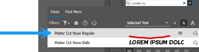 However, on both the Mac and the Win machine, Type > Find/Replace Font does NOT list the Poster Cut Neue font (however, in a New document on the Mac when I use this font, it does!)
