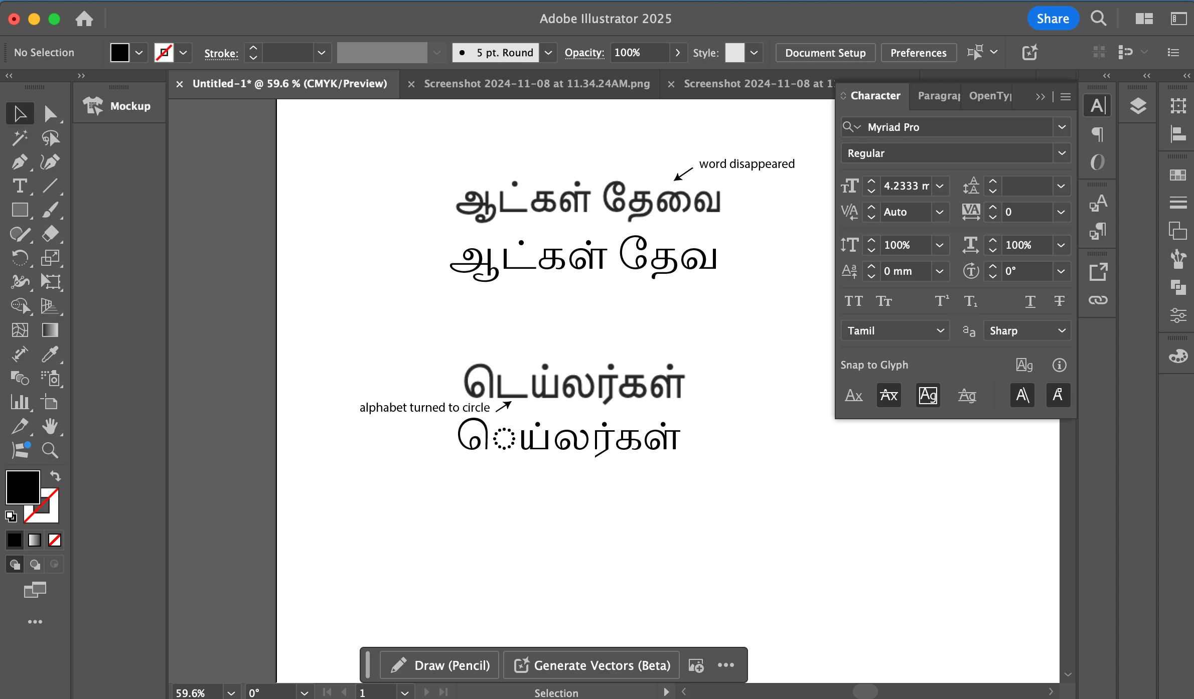 I'm having an issue when using a Tamil font where there is a small circle with dots that appears in the middle of glpyh. This typeface is Akhand Tamil from Adobe fonts and when I enter the same line of text in the font preview for Adobe fonts it looks perfectly normal. However, when using illustrator it gives me this circle. I have already gone into the type settings and turned on "Show Indic Options" as well as changed the language to Tamil in the Characters panel.