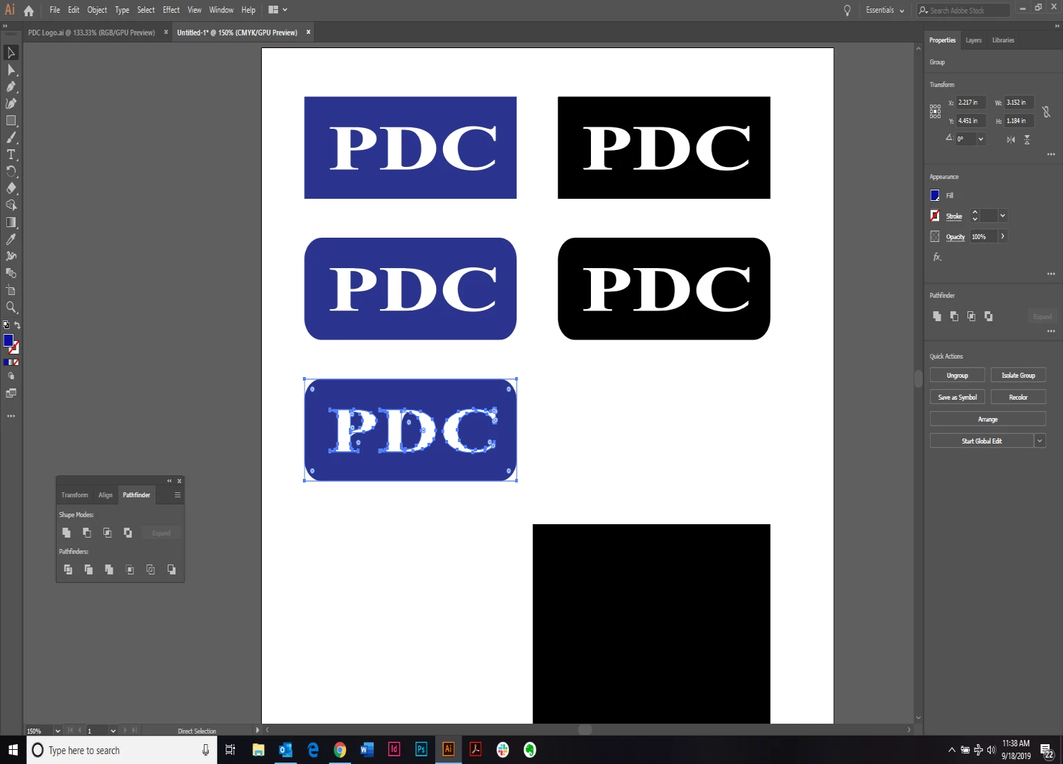 See in image that the "PDC" that is selected it doesn't cut out clean. When I outline the text it's clean but as soon as select "minus front" in pathfinder it rounds out that area in the letter "D"(upper left inside corner of D) and a area in the letter "P"
