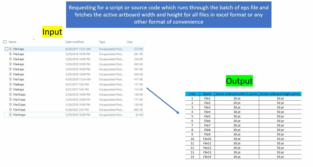 Requirement: i need a script or code that run through this bunch of illustrator batch files (eps files) at a time and fetches the active artboard width and height dimensions for all batch files and print this data in an excel.