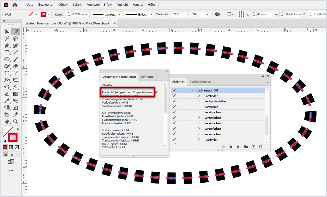 An "echte" Daten komme ich erst wieder nach dem Jahreswechsel. Aber ich kann sicherlich etwas basteln. Es geht tatsächlich ausschließlich um in Illustrator erstellte gestrichelte Konturen auf geraden und auch auf gebogenen Pfaden.
