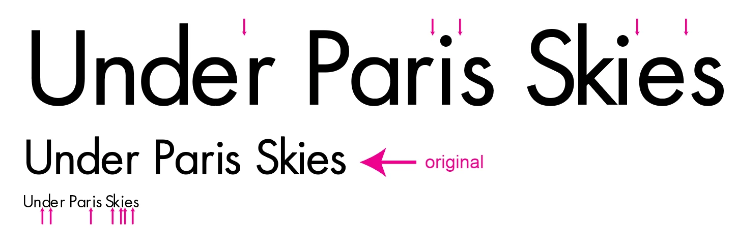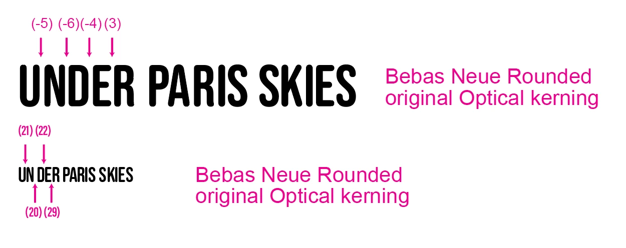 After creating custom kerning at one type size, the scaled version's kerning randomly increases or decreases. I've marked some of the surprising increased and decreased kerning on the scaled type. Any idea what is going on here?