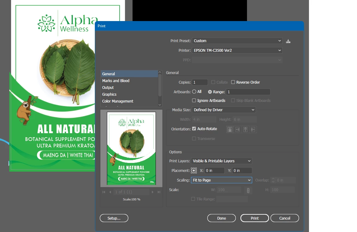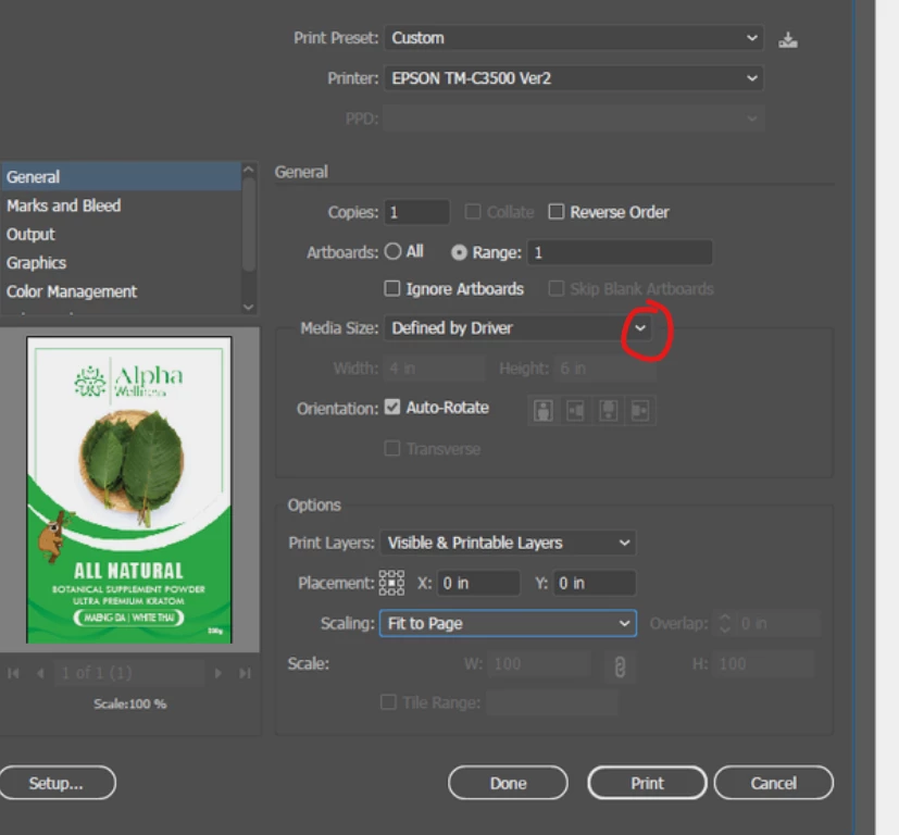 Noob here, i searched the forum but couldnt find anything for this issue. so basically I had a label designed by someone, and my intent is to print to a epson TM-C3500, the size of the label is 4x6in, the media is rather expensive so i cant waste alot on trial and error. Ive tried the fit to page option and unfortunately it condenses the label too much, can someone give me a suggestion? thank you.
