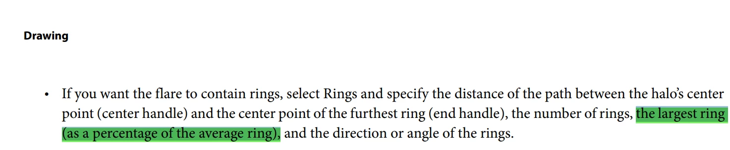 In the Adobe Help Guide, it is stated that the "largest ring" is calculated as a percentage of the average ring. However, when experimenting, I noticed discrepancies in the results. For example, when creating a flare with a 100pt diameter, 5 rings, and setting the largest ring to 100%, with the path set to 300pt, the calculated ring sizes are: 10pt, 10pt, 75pt, 150pt, and 300pt. When I calculate the average of these rings, it comes out to 109pt, but the largest ring is not 100% of this average size. Could you clarify how Illustrator calculates the largest ring and why the results seem to differ from the described method?