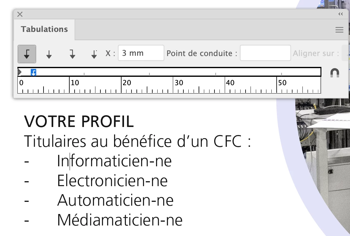 Dans ma capture d'écran, j'ai mis 3mm de tabulation, mais l'alignement se s'y conforme pas.