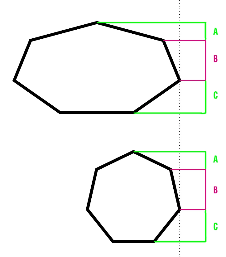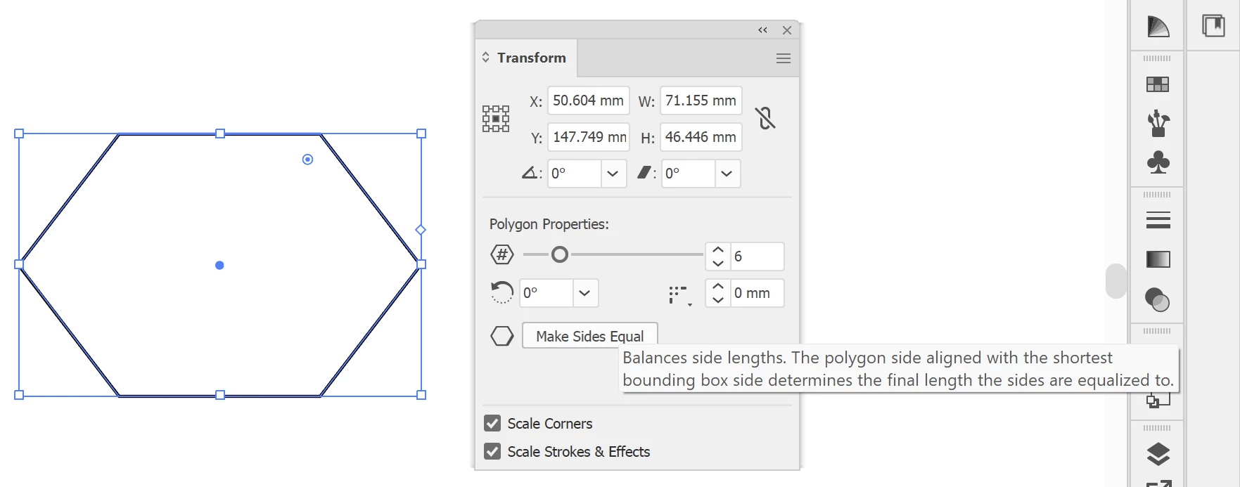 In the process of equalizing the side lengths of a polygon, the side aligned with the shortest dimension of the bounding box determines the final length to which all sides will be equalized. Consider a hexagon where the top and bottom sides measure 35.58 mm, and the remaining four sides measure 29.25 mm. Which side will be used to equalize all the sides, and could you please provide a detailed explanation of this concept with this or another example?I have attached an example.