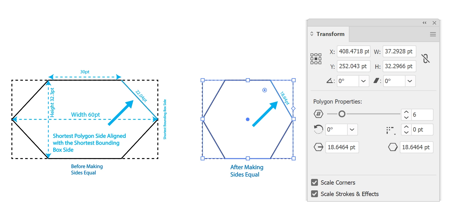 Specifically, I have a polygon with one side aligned to the shortest side of the bounding box, which measures 22.04 pt. However, when I adjust the polygon so that all sides are equal, the side length changes to 18.64 pt instead of remaining at 22.04 pt.
