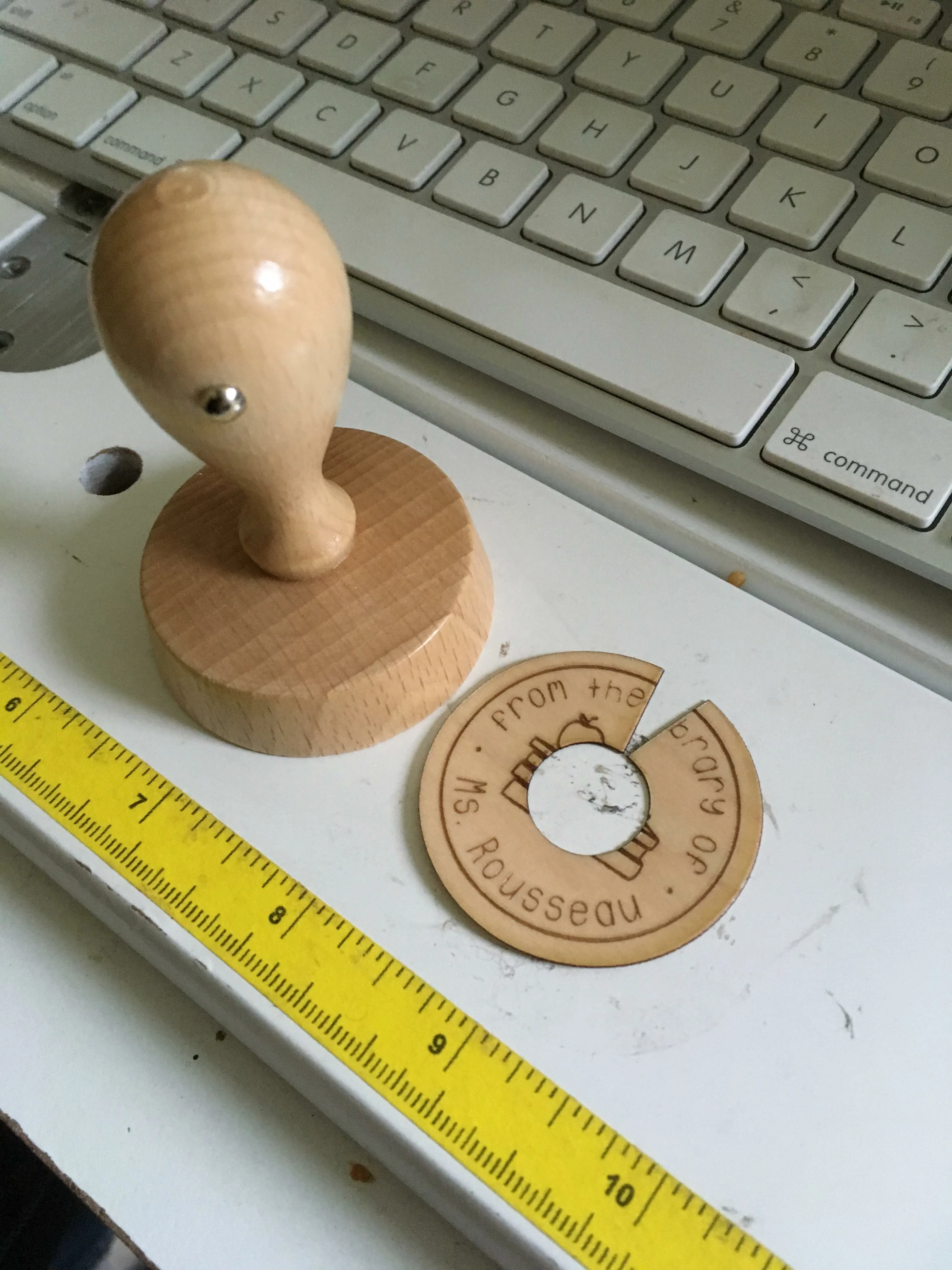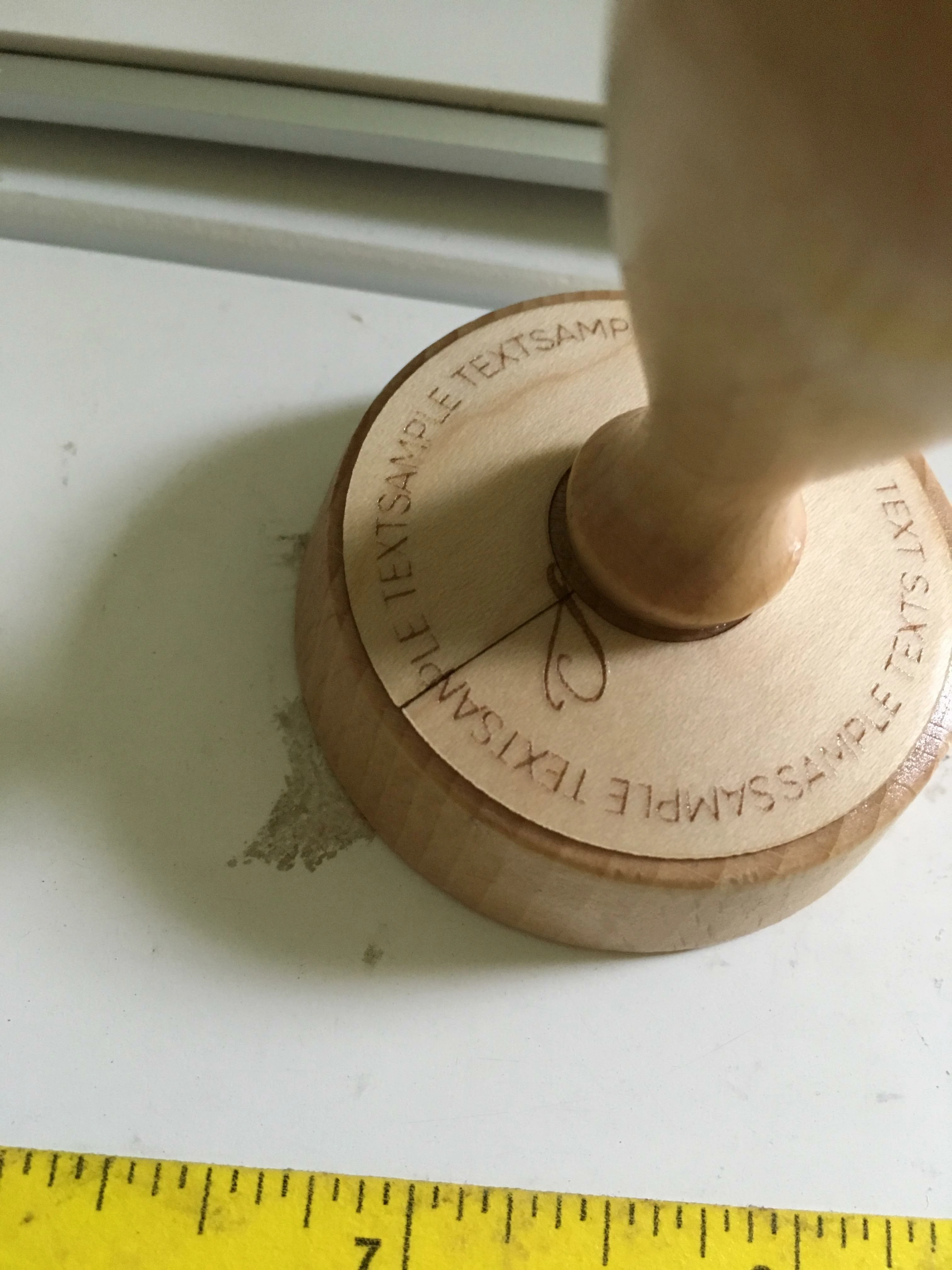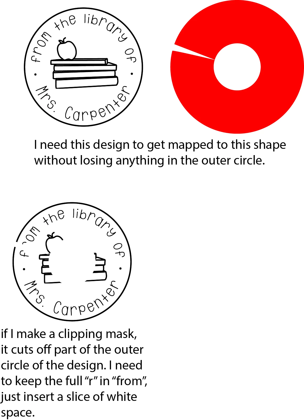 Thanks for the responses! Maybe I need to explain myself a little better. I make stamps and the top of the stamp is beveled a little. I cut out a thin piece of wood that I engrave the image of the stamp on, and then attach it to the top of the stamp. I need to cut out the circular piece of the hole of handle of the stamp and the triangle piece so that the engraved image on top comes together (due to the bevel). I am hoping to figure out a way to stretch or change the image somehow in Illustrator, so that when I put the wood piece on top of the stamp it looks like the original image, and not like a chunk is cut out of it for the bevel. The teacher stamp is just an example, but I have others where there is a design and text around the whole circle, so I can't just find a blank space to remove the text from. In the attached example I have cut the little sliver out of the wood so it will fit on the beveled part, but then I am missing part of an "M" and "P". Thanks so much for your help!