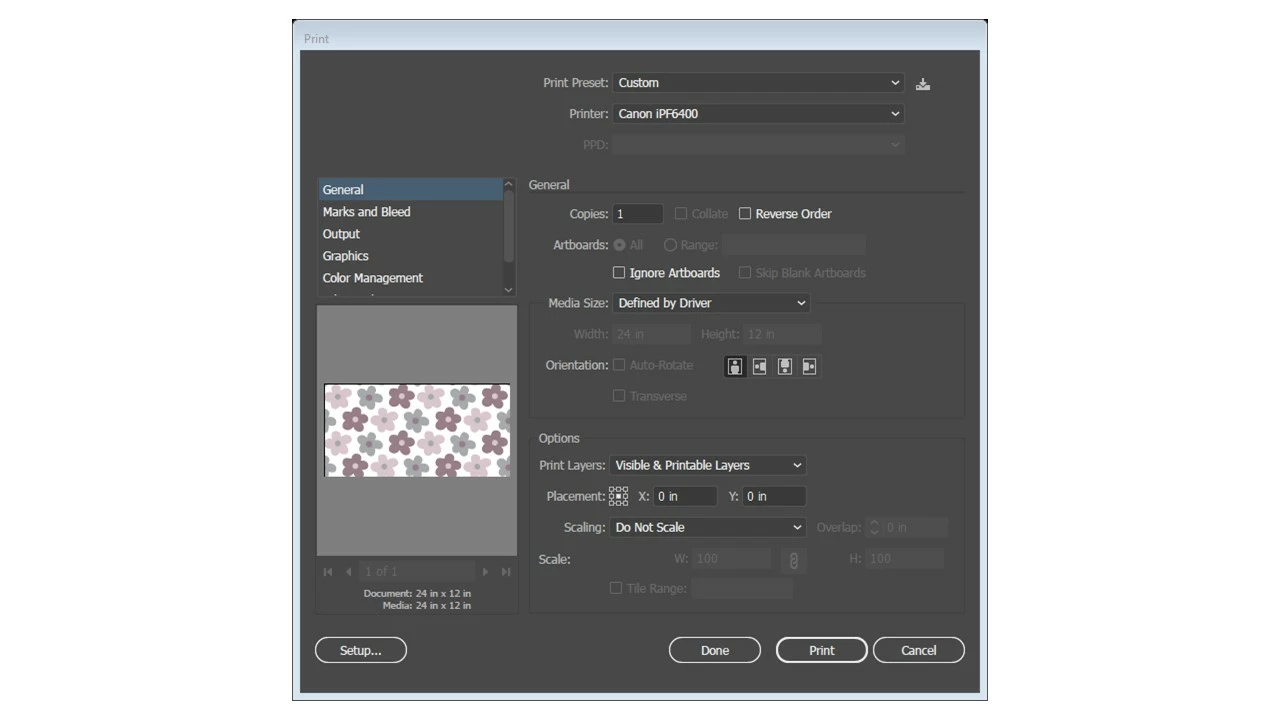 I am trying to print borderless on a large format printer that supports borderless. It was previously doing so. Now it is printing with a margin/border on one side and on the bottom. This is what it looks like on the artboard when I choose show print tiling (I'm not tile printing, just to see what's happening) it shows the one sided border and on bottom. I can't figure out what is going on.. Thanks in advance for any insight