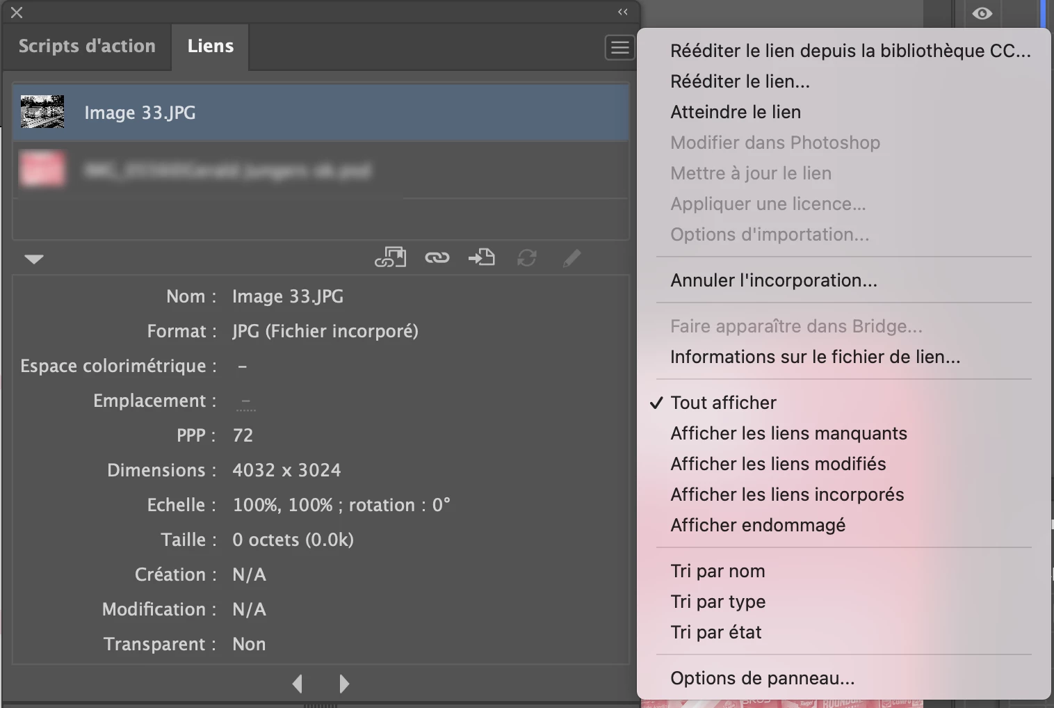 Je cherche à modifier un lien incorporé dans un fichier Illustrator. Or l'option "Modifier dans Photoshop" est grisée.