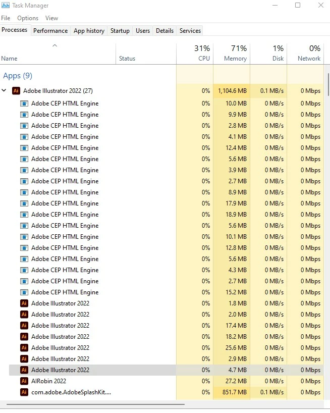 So here is my question. Why so many instances? Also; Illustrator likes to crash alot and before it is questioned it is not my PC as I have looked that issue up before posting here. I would like to use adobe products more but they seem very unstable.
