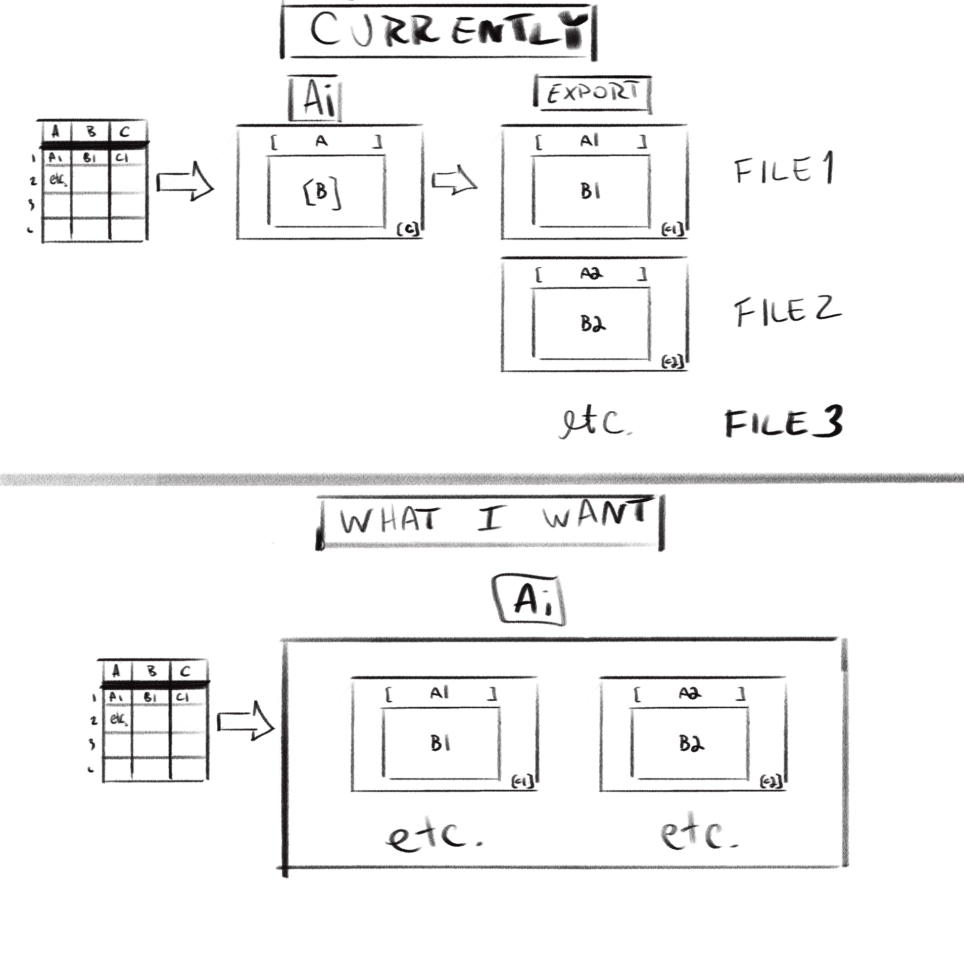I've read through this article about variables in Illustrator (Merge data to create data-driven graphics through templates and variables in Illustrator) and I only see a way to export each record/index from the data set into its own file.