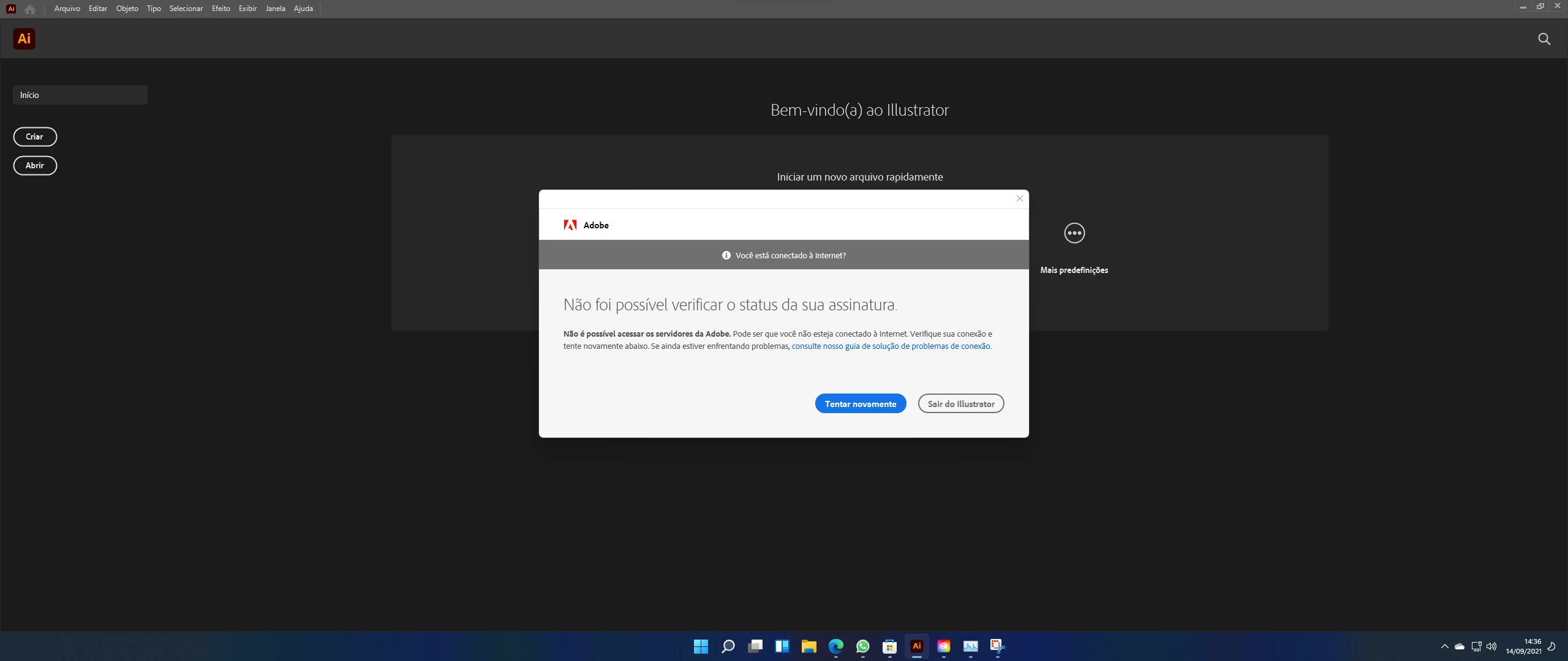 Após reiniciar o meu computador na data de hoje, recebo a seguinte mensagem ao abrir qualquer aplicativo Adobe, no caso, tentei abrir o Illustrator, porém acontece com todos, até mesmo o Adobe Acrobat.