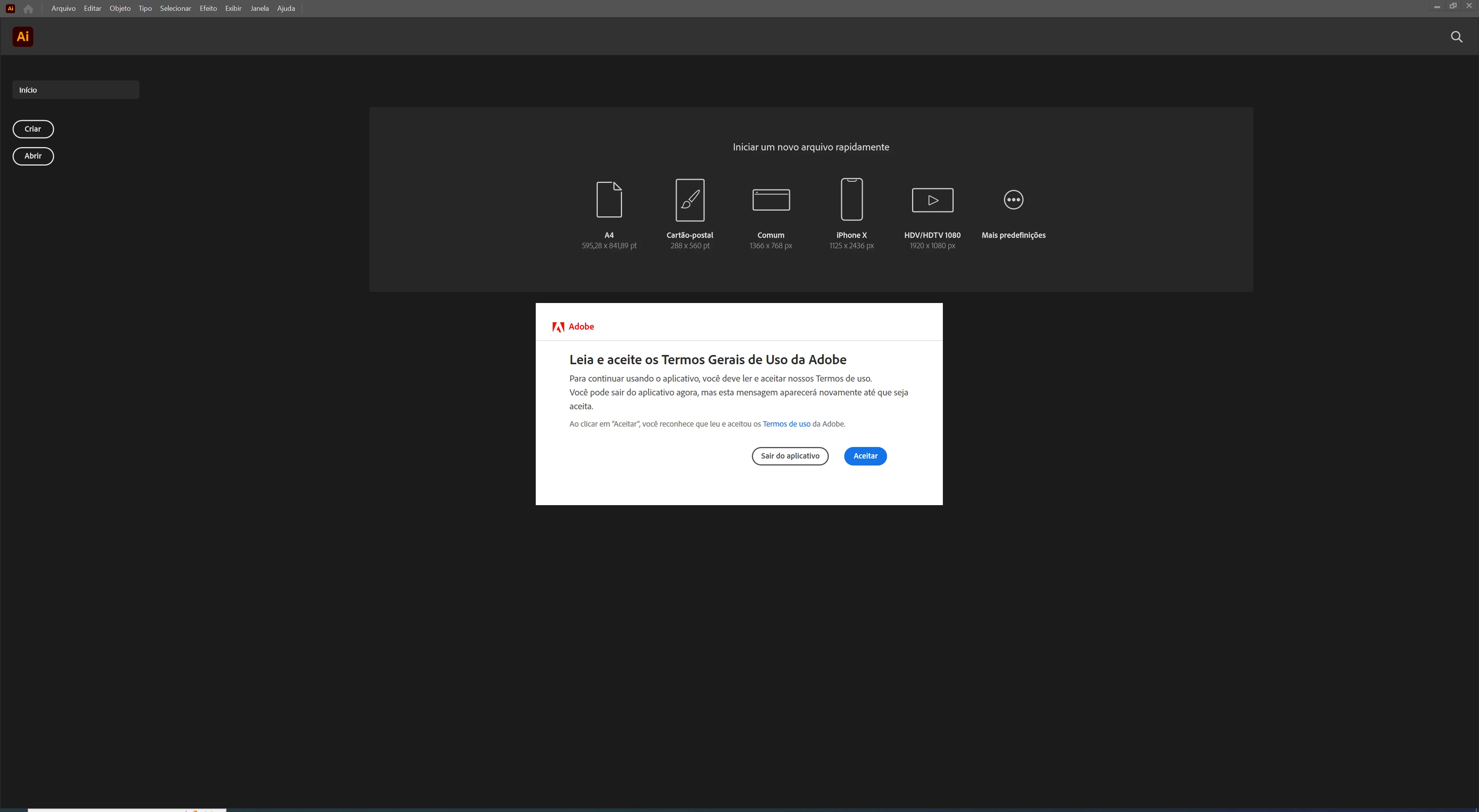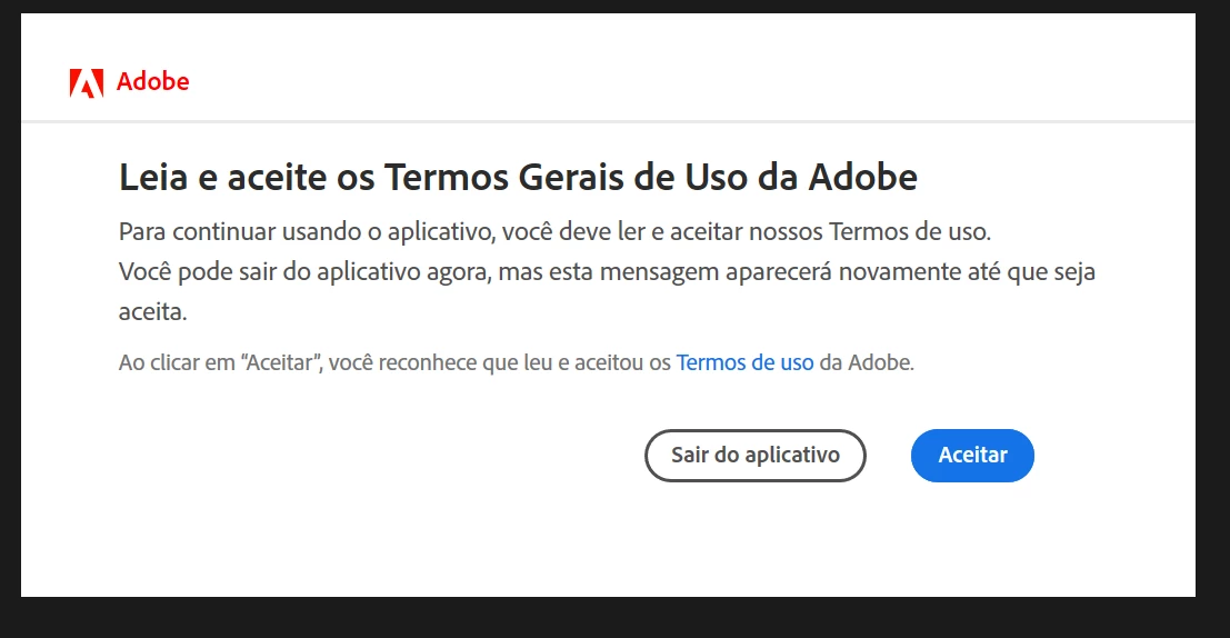 Não consigo aceitar os termos de uso do Adobe Illustrator