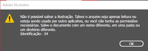 Venho usando o Illustrator 2020 24.0.1 64-bit e depois de um tempo, não consigo mais Salvar um arquivo .ai quando faço alterações nele, aparece a mensagem: "Não é possível salvar a ilustração. Talvez o arquivo seja somente leitura ou esteja sendo usado por outro aplicativo, ou você não tenha as permissões necessárias. Salve o documento com um nome diferente, em uma pasta ou um diretório diferente. Identificação: -54".