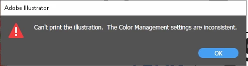 When trying to print, the print preview pane is blank, and "Can't print the illustration. The Color Management settings are inconsistent." error message pops and printing fails. If other printers are chosen, the preveiw is shown ok, and it prints ok.