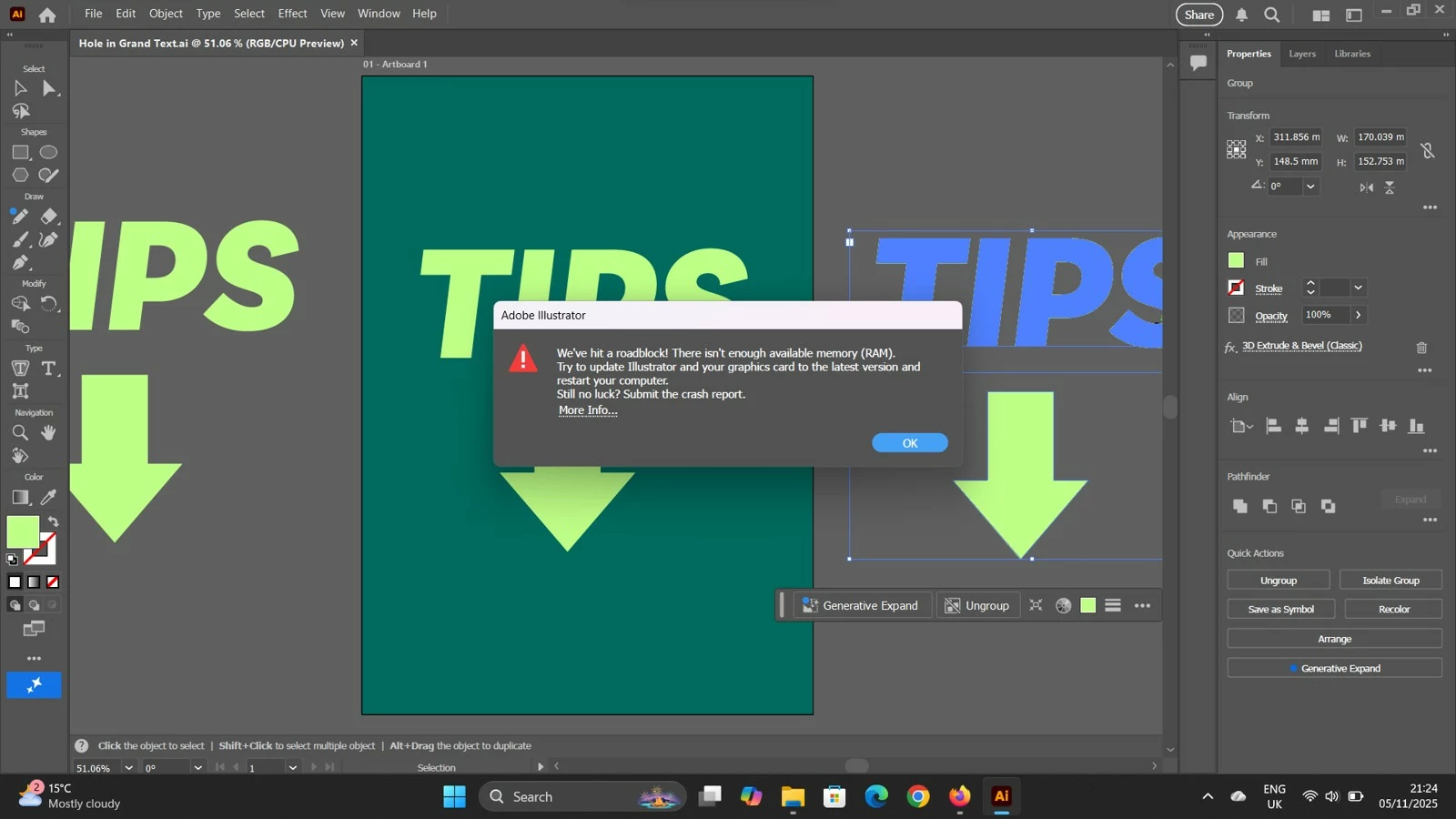 I have been using Illustrator for a while now. I recently started doing some 3D work. Whenever I use Illustrator to use the 3D classic effects, it comes up with a message saying, "We hit a roadblock! There isn't enough available memory (RAM). Try to update Illustrator and your graphics card to the latest version and restart your computer. Still no luck, submit the crash report."